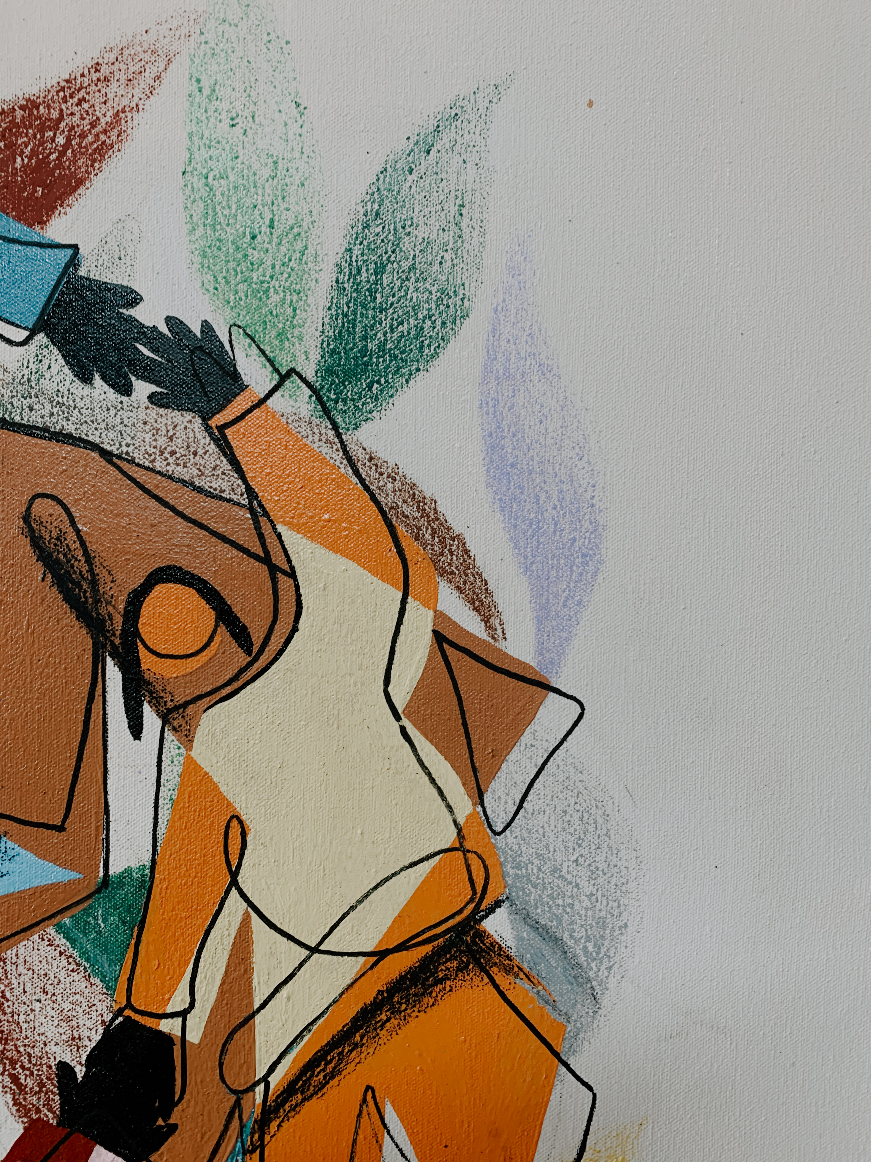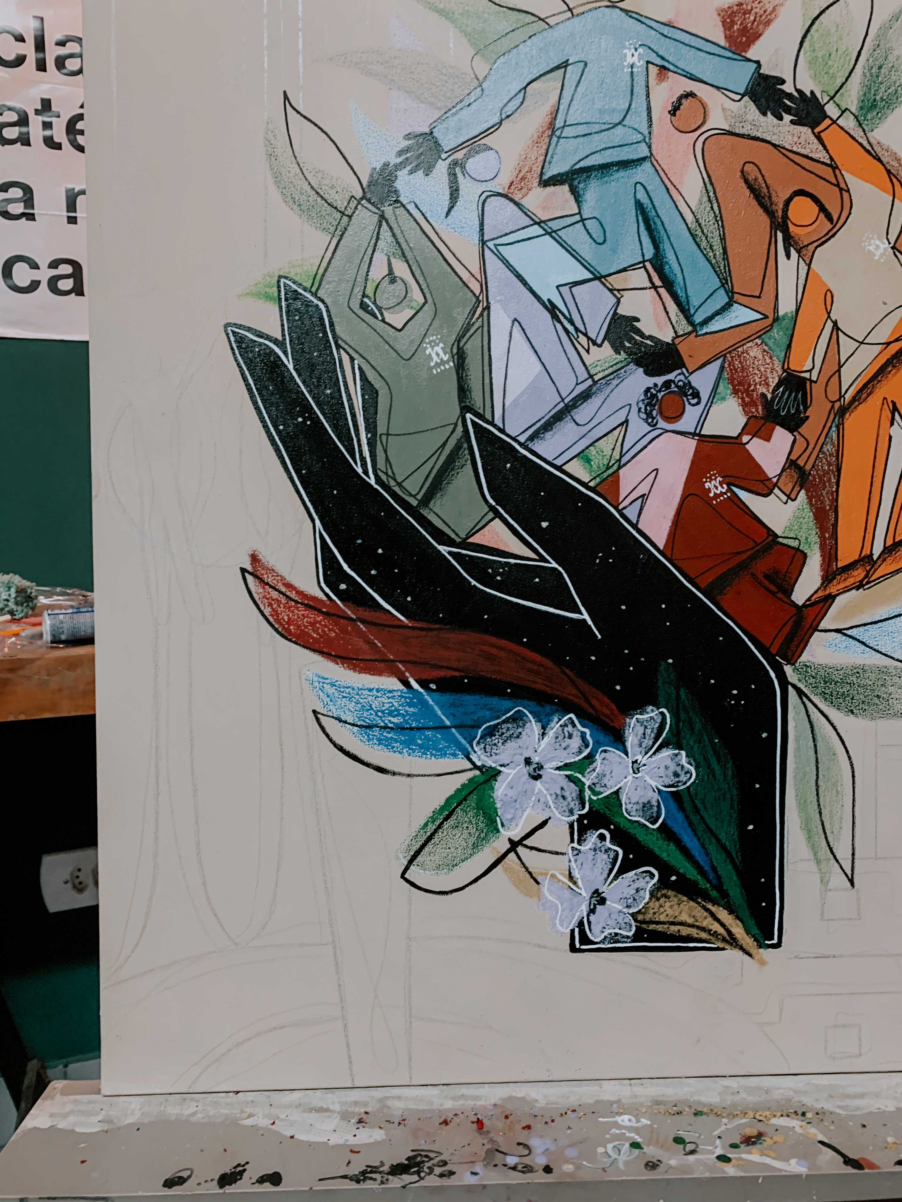 hoje essa tela fica exposta na recepção do Colégio Marista de Londrina. fiquei muito feliz por ter sido escolhida pelos alunos e por termos vencido a gincana. achei o resultado extremamente lindo, mais do que eu esperava, pois era um tema que não costumo ter no meu dia a dia. amei as cores, as texturas, as características dos personagens, as sobreposições e o significado disso tudo.