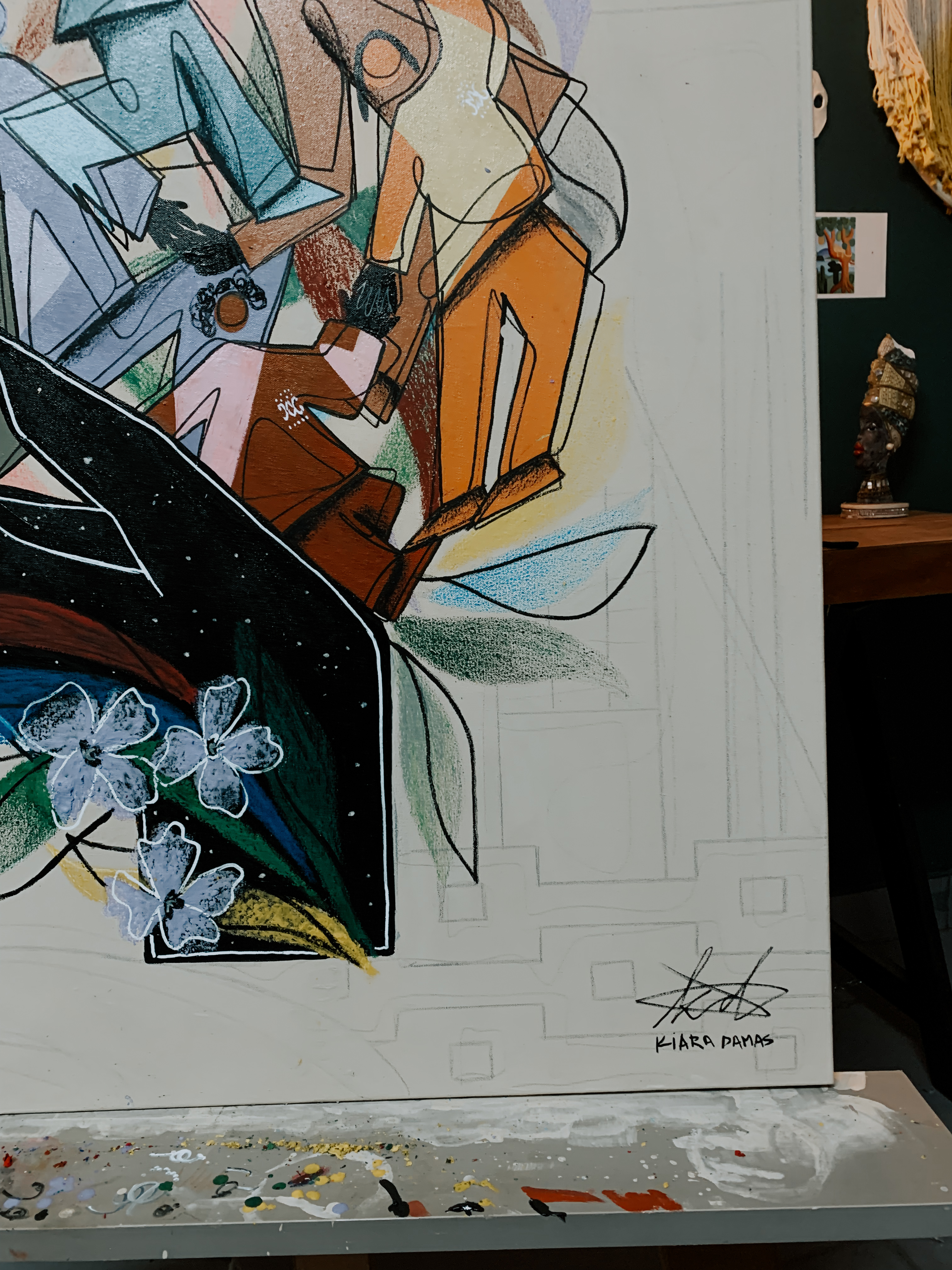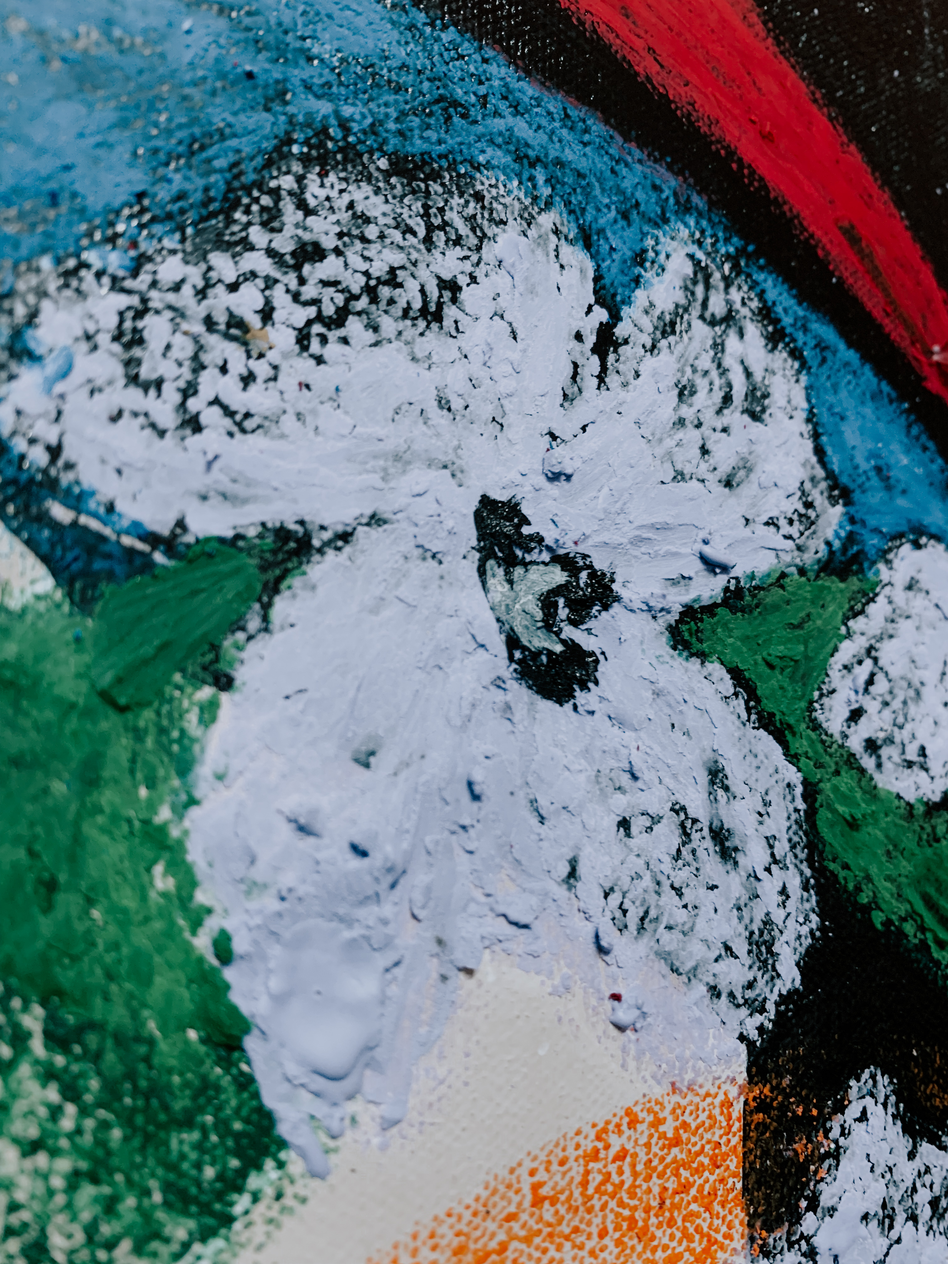 no processo, experimentei usar diferentes materiais e técnicas para criar camadas, contrastes e texturas. usei tinta acrílica, giz pastel, caneta prata e também derreti o giz pastel criando um relevo diverso nas flores.