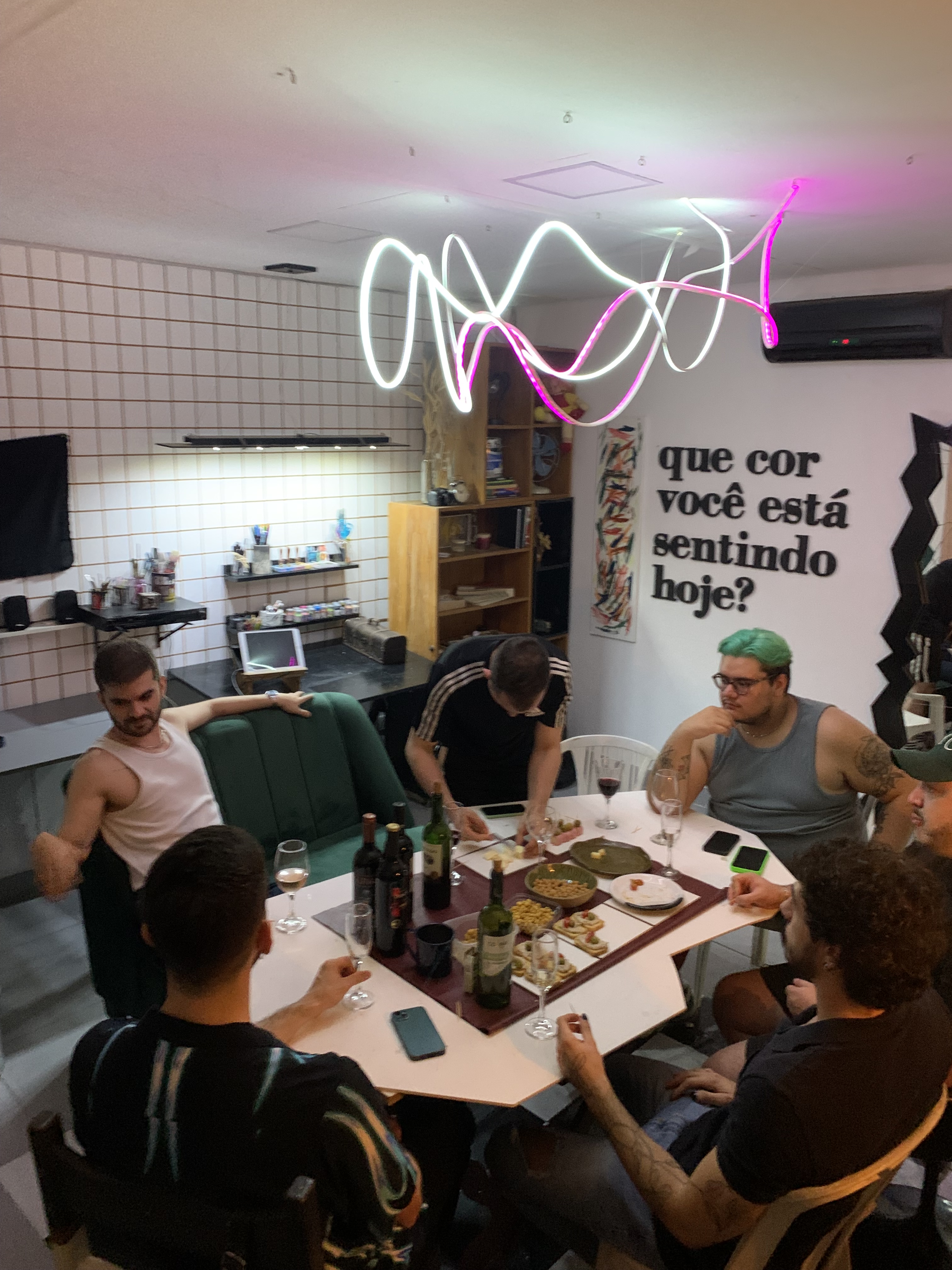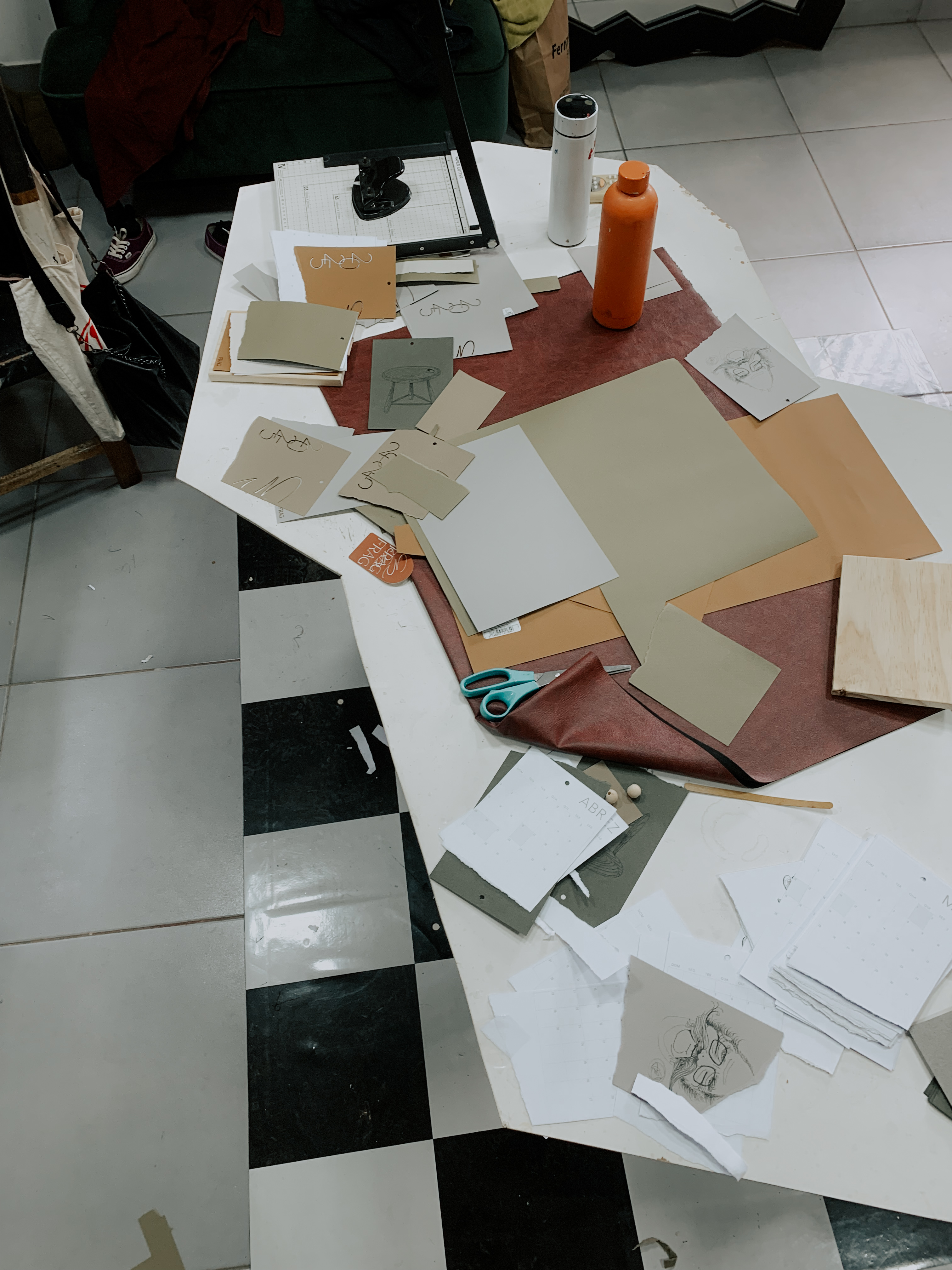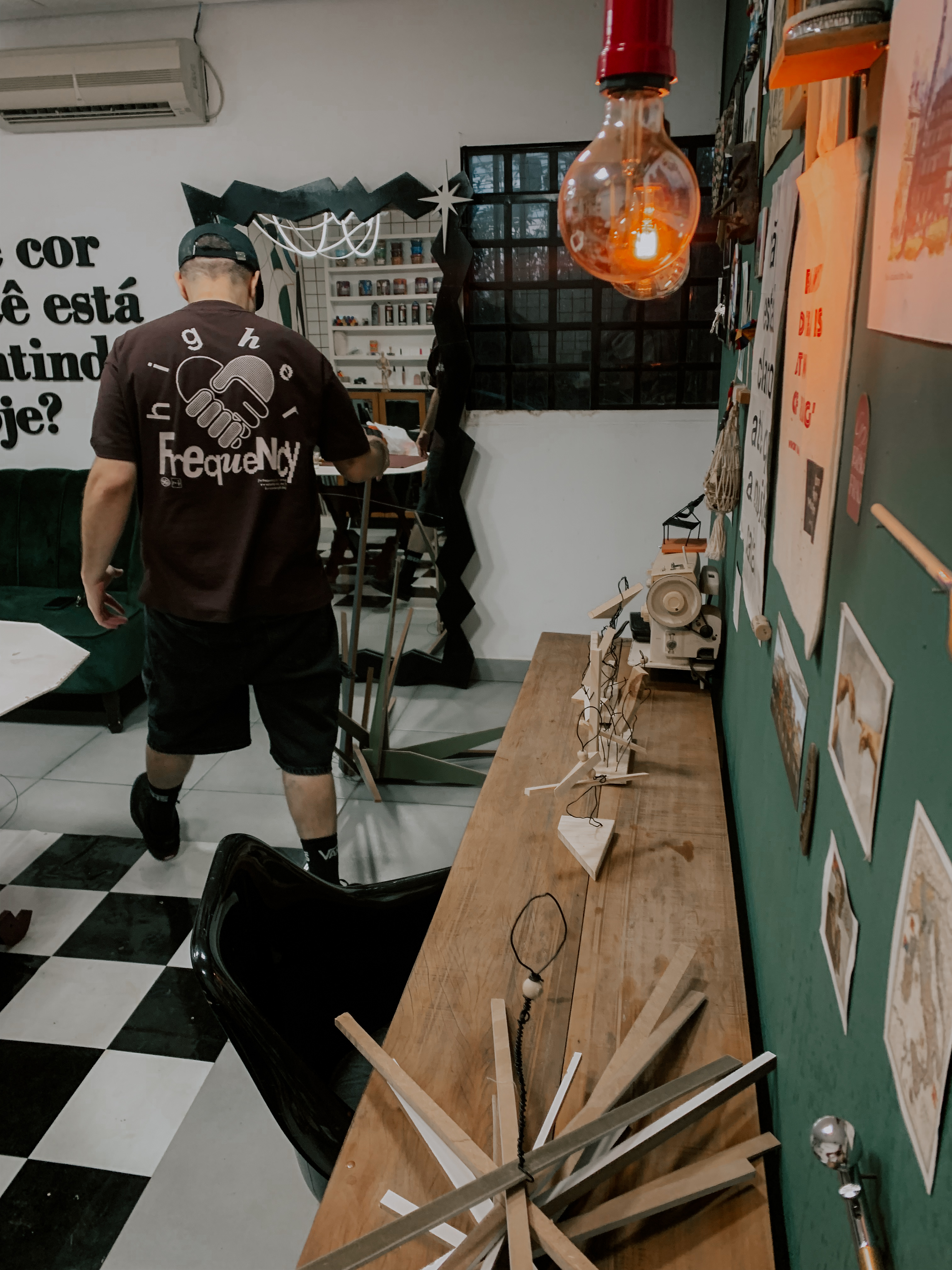 ele fica dentro da marcenaria do meu pai. apesar de às vezes me incomodar, acho legal a trajetória para chegar nele: você passa por um caos, máquinas barulhentas e muito pó. encontra uma escada e sobe sem entender muito, do nada uma portinha & tchanannn. gosto de olhar para ele e pensar no conselho da minha mãe: comece com o que você tem. a gente tem muito e nem sabe. esse lugar parecia uma sauna, dividi parede com um compressor de ar extremamente barulhento, paredes rebocadas e peguei madeira do lixo para fazer minhas mesas.