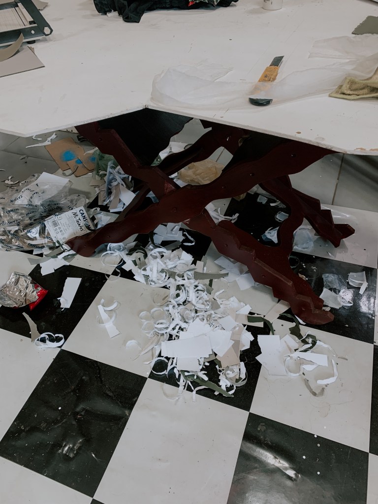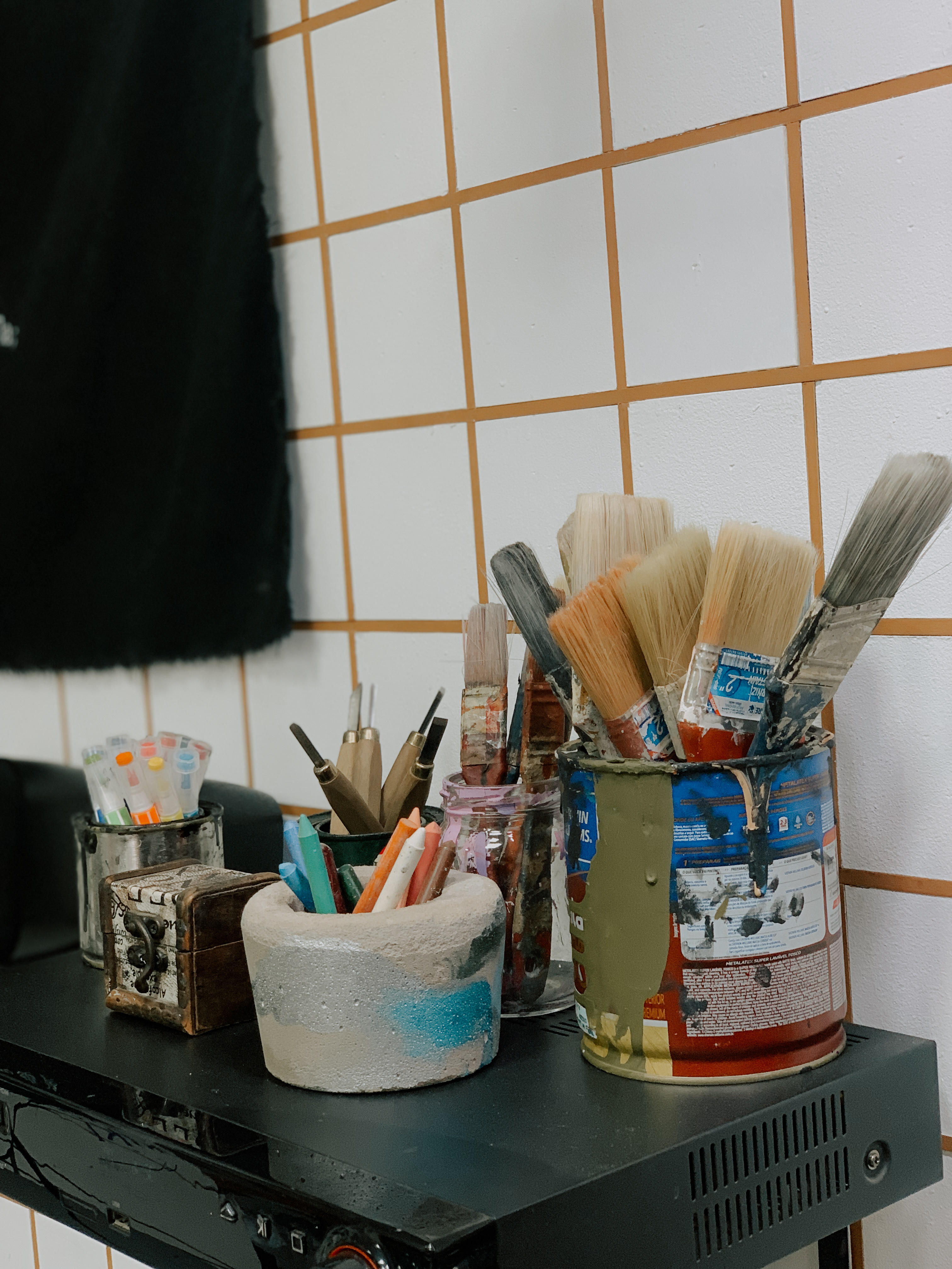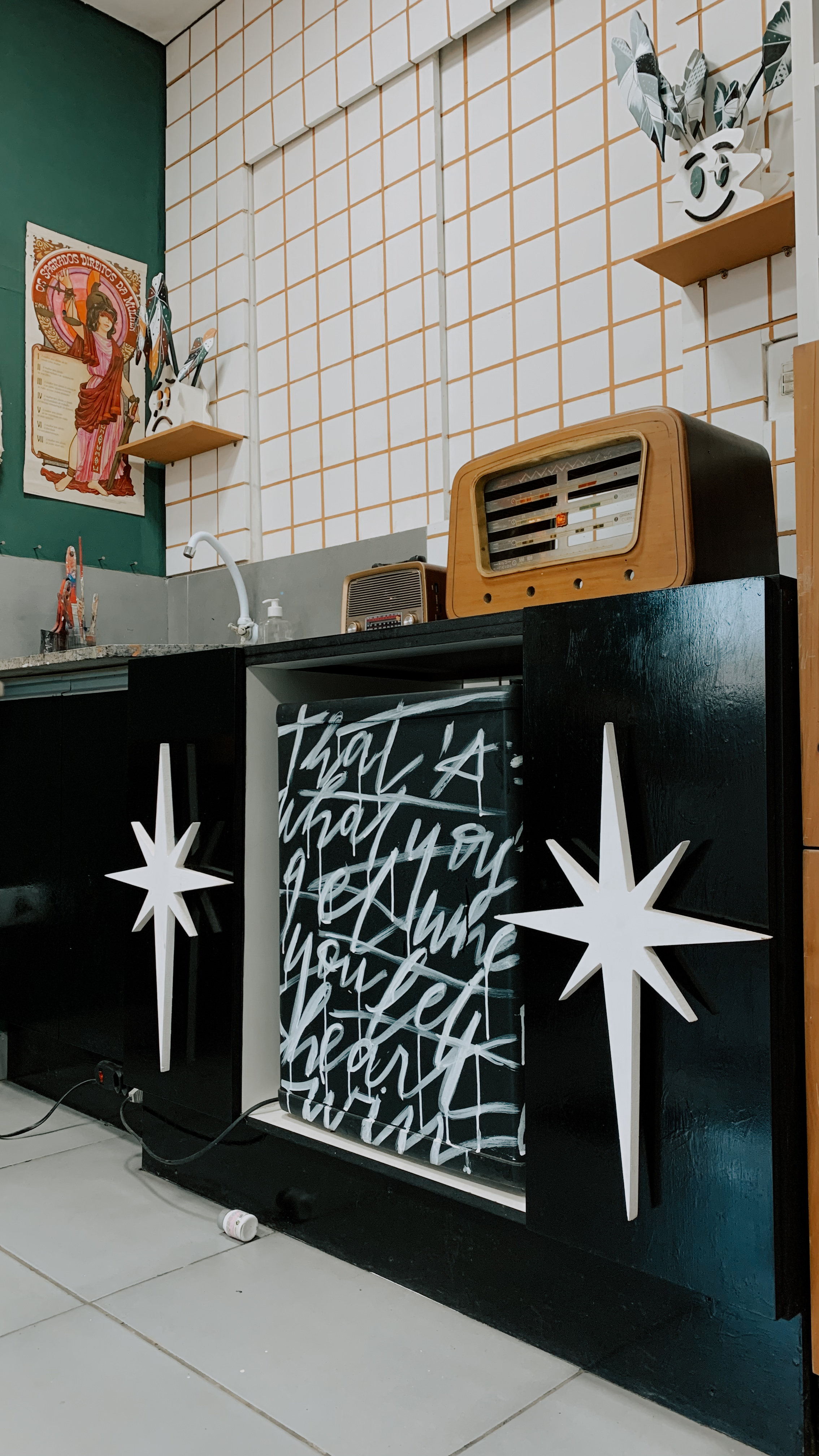 ele fica dentro da marcenaria do meu pai. apesar de às vezes me incomodar, acho legal a trajetória para chegar nele: você passa por um caos, máquinas barulhentas e muito pó. encontra uma escada e sobe sem entender muito, do nada uma portinha & tchanannn. gosto de olhar para ele e pensar no conselho da minha mãe: comece com o que você tem. a gente tem muito e nem sabe. esse lugar parecia uma sauna, dividi parede com um compressor de ar extremamente barulhento, paredes rebocadas e peguei madeira do lixo para fazer minhas mesas.