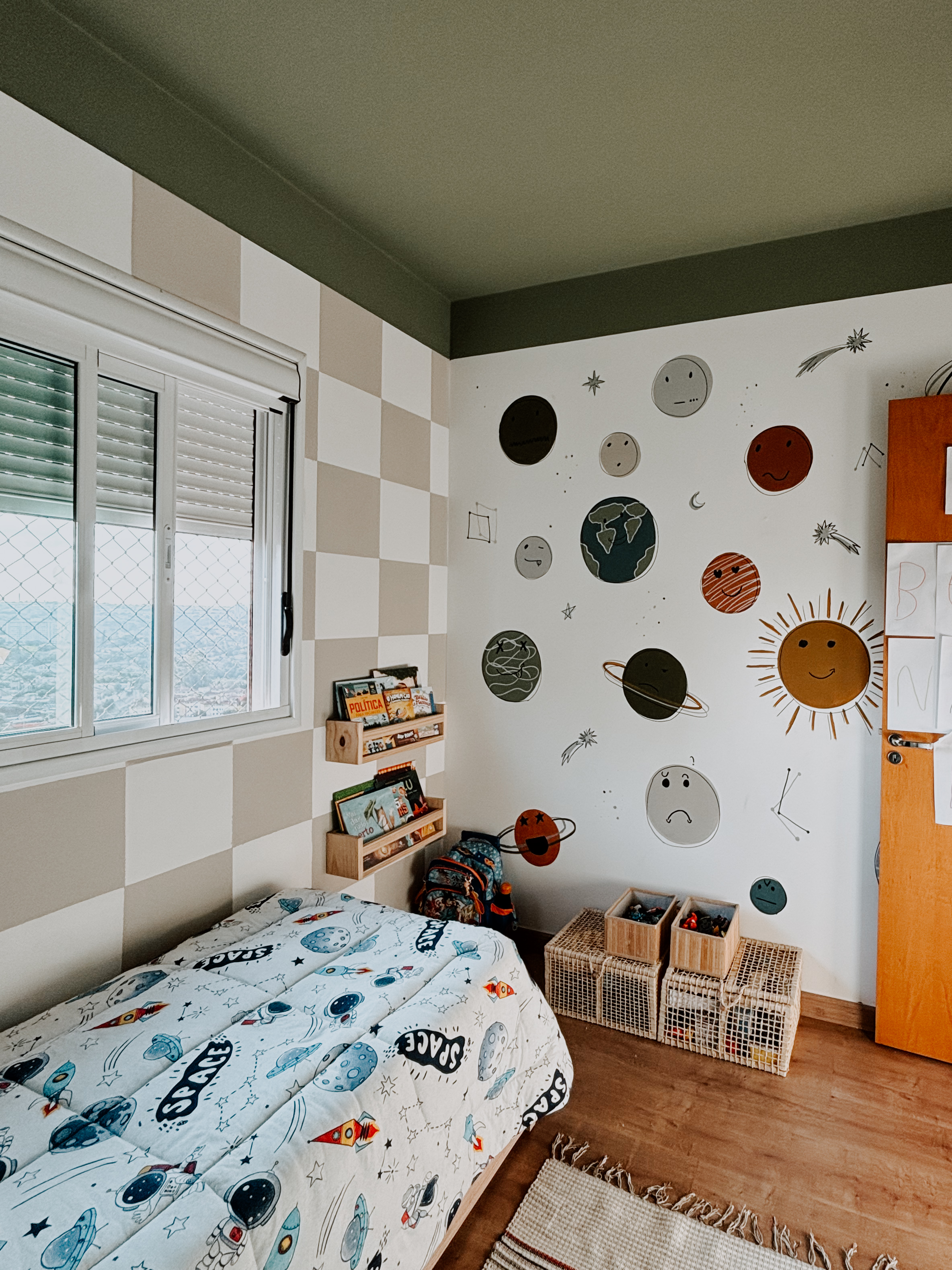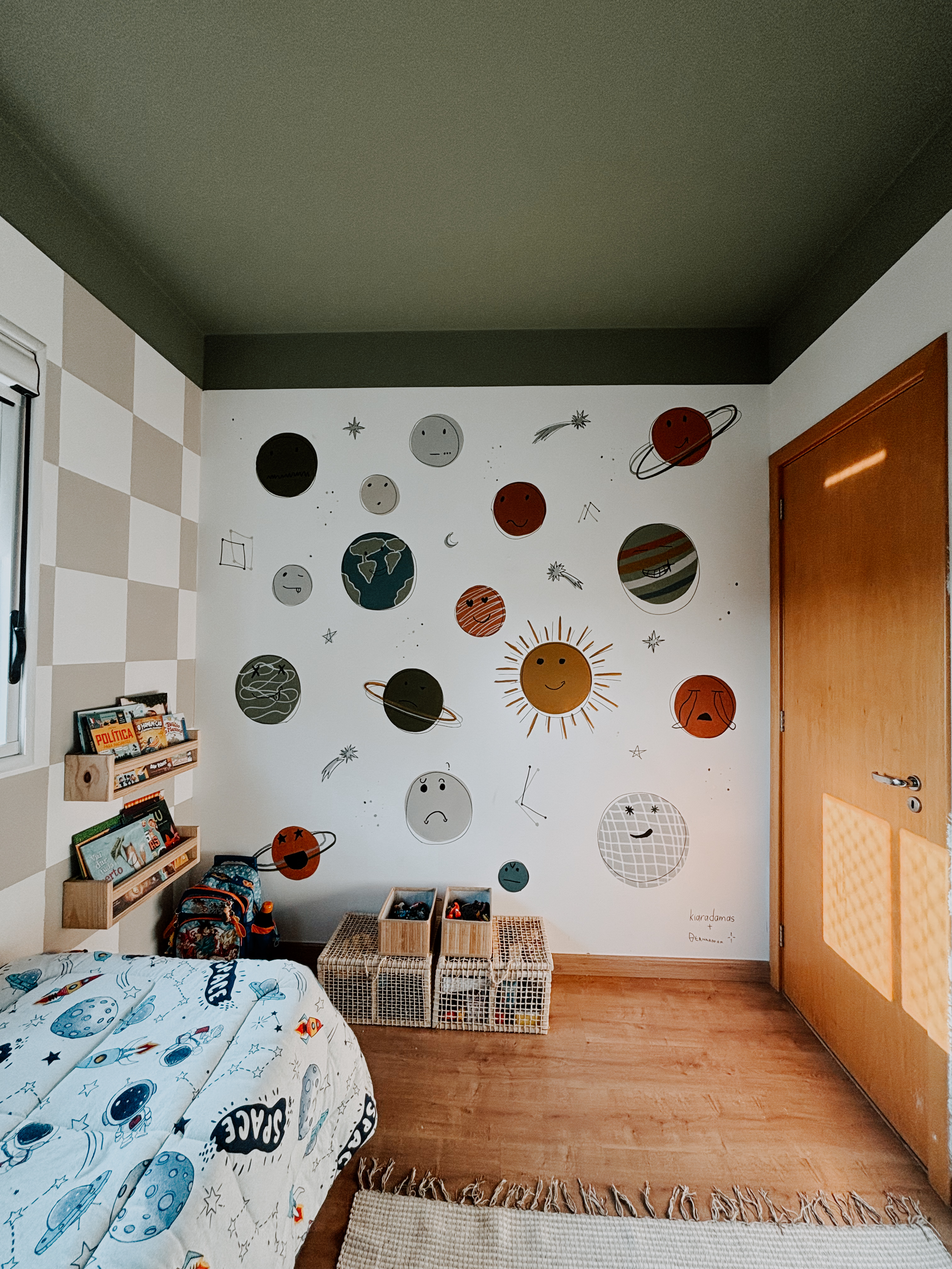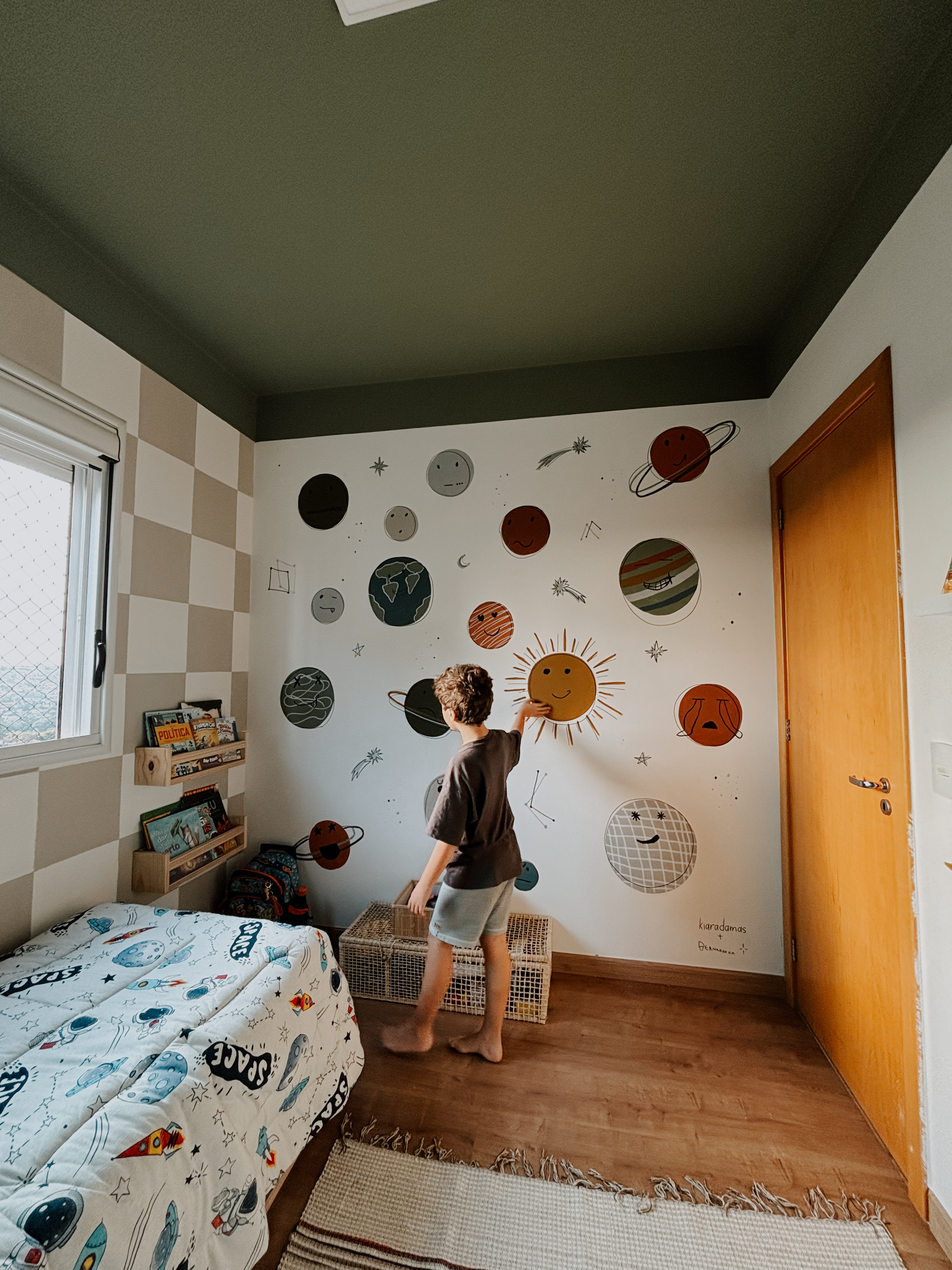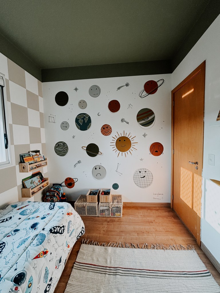 este quarto não pintei sozinha. bernardo esteve comigo em todas as etapas, desde escolher e decidir sobre a arte, até a assinatura. existem muitos significados na pintura desse quarto. fizemos ele focado no espectro autista dele. para saber mais da minha inspiração e resolução, você pode checar nos destaques do meu instagram.