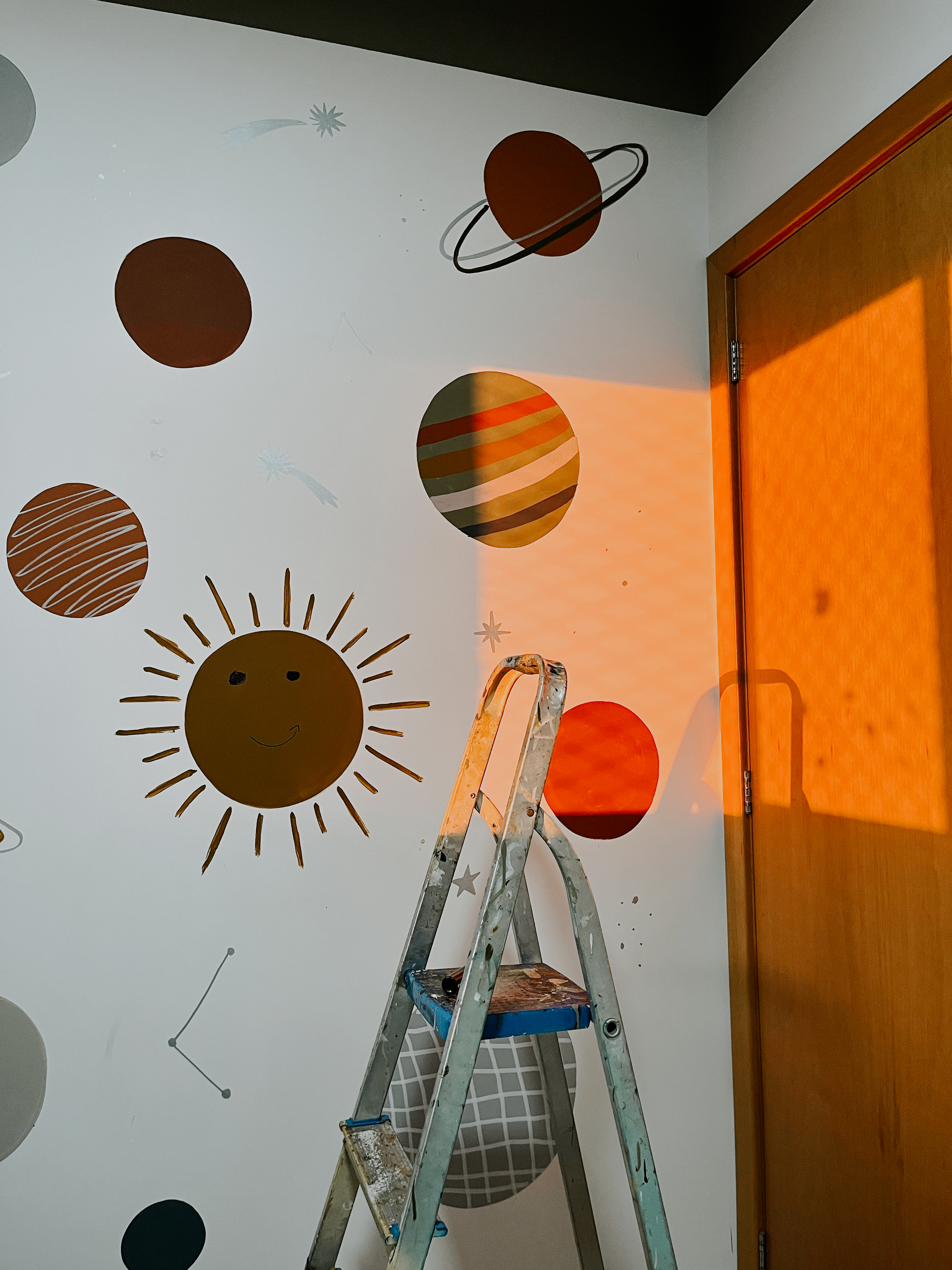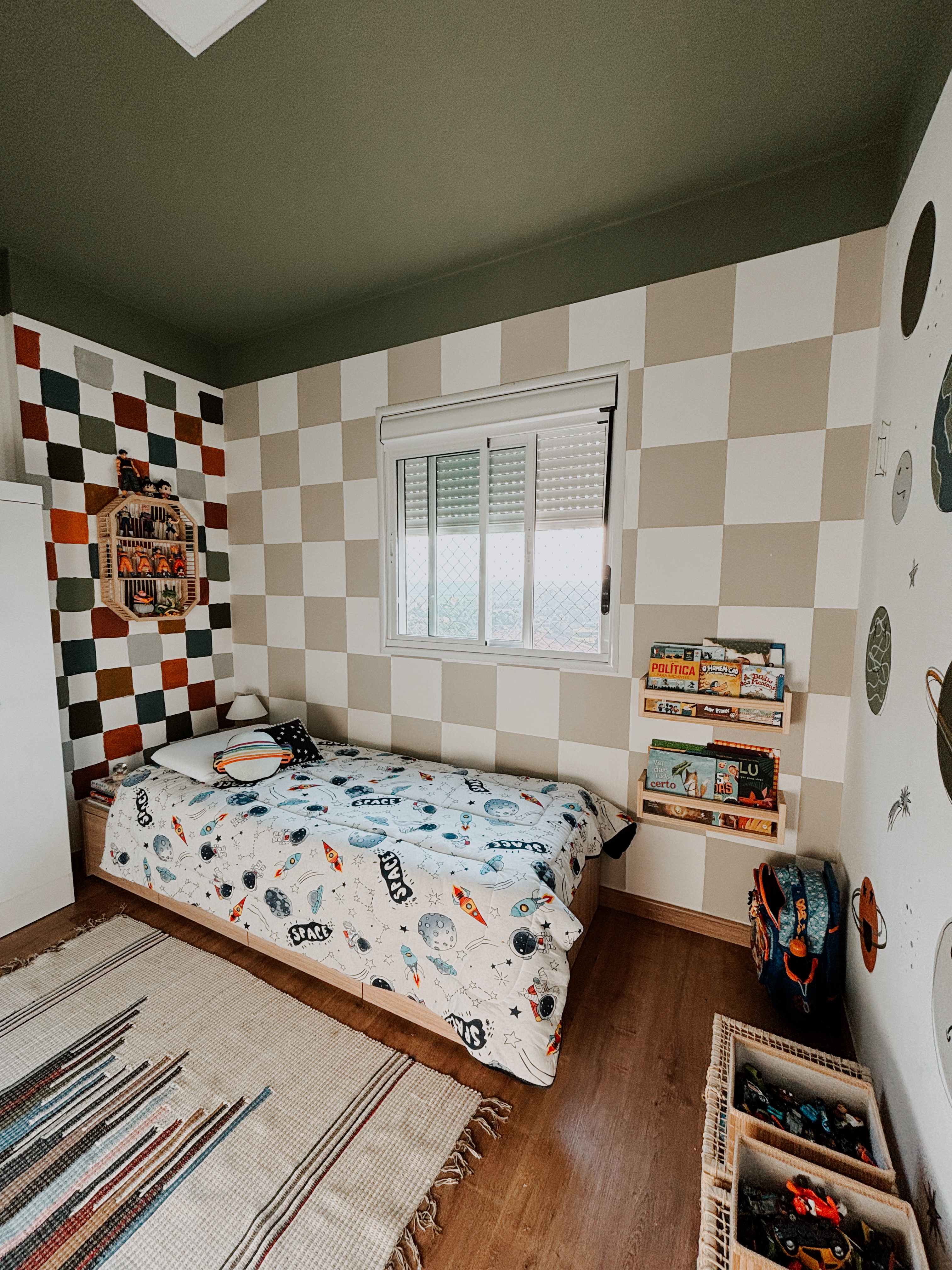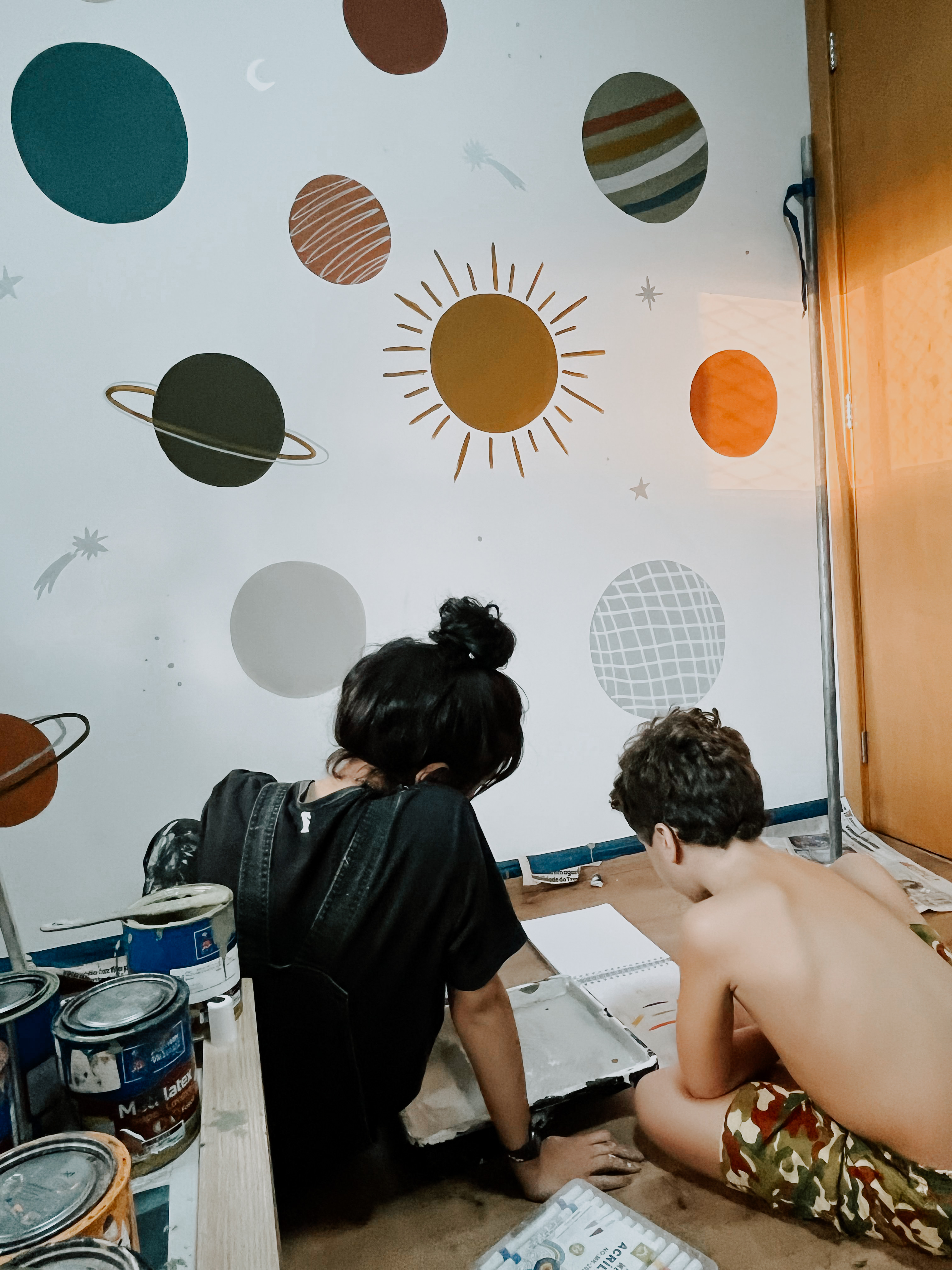 este quarto não pintei sozinha. bernardo esteve comigo em todas as etapas, desde escolher e decidir sobre a arte, até a assinatura. existem muitos significados na pintura desse quarto. fizemos ele focado no espectro autista dele. para saber mais da minha inspiração e resolução, você pode checar nos destaques do meu instagram.